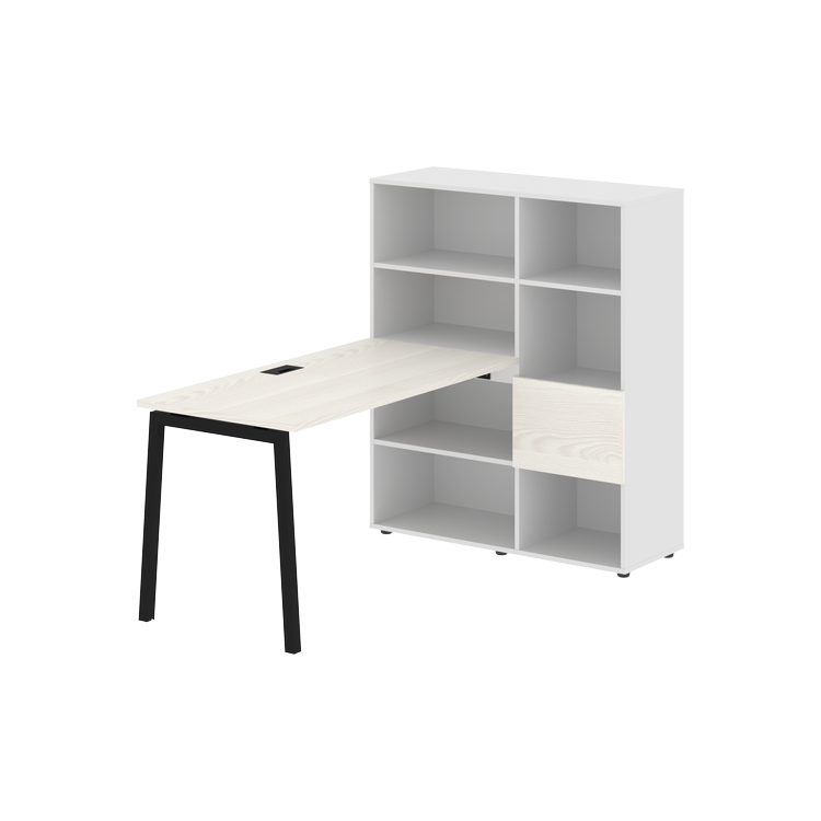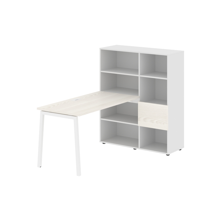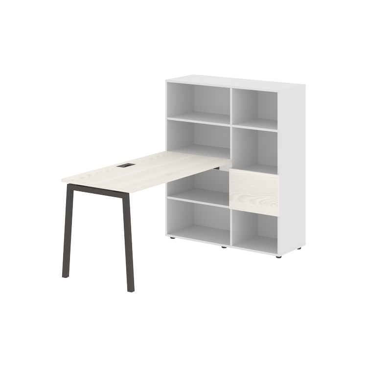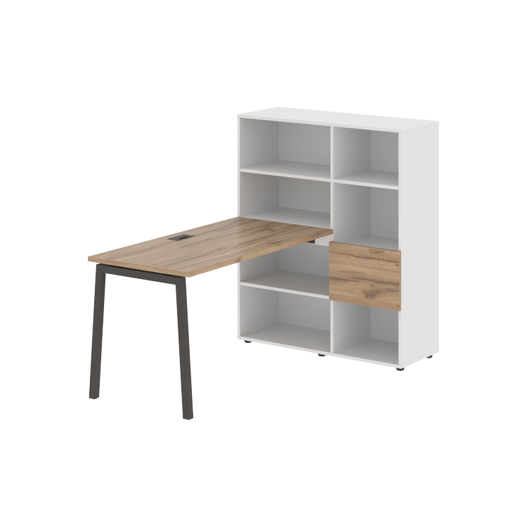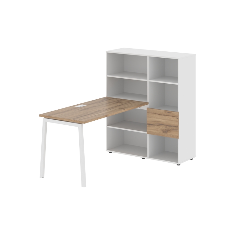 Каркасы стеллажей полностью из ЛДСП т.18 мм с кромками ПВХ т.2 и 0,45 мм, задняя стенка из ЛДСП. Комплектуется малой дверью в цвет столешницы и регулируемыми опорами h= 27 мм.