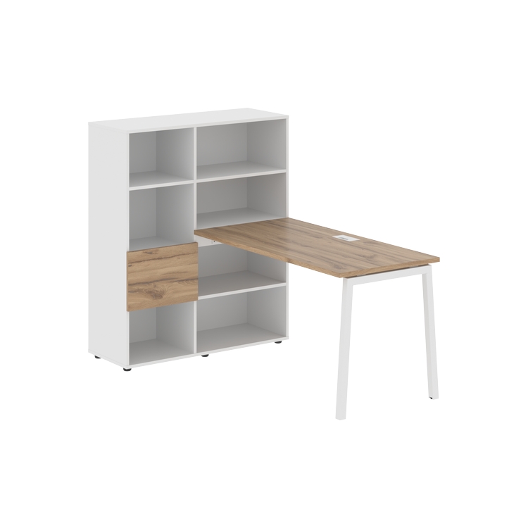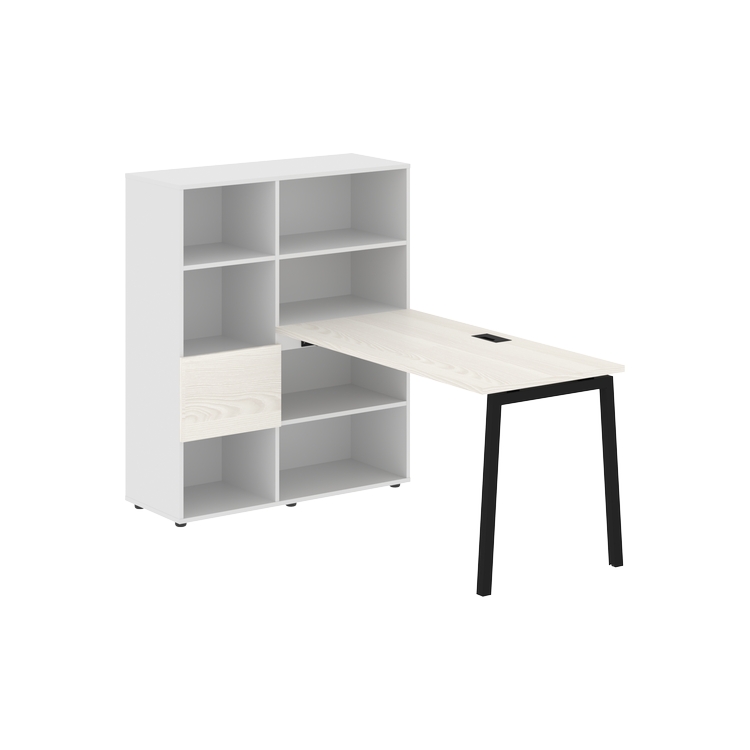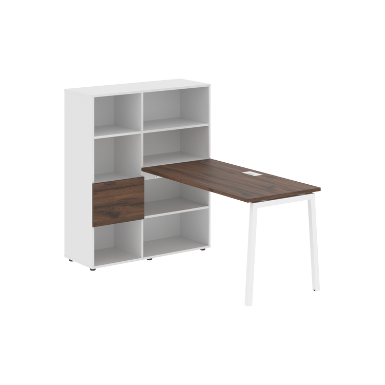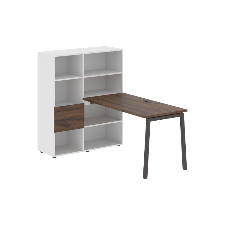 Каркасы стеллажей полностью из ЛДСП т.18 мм с кромками ПВХ т.2 и 0,45 мм, задняя стенка из ЛДСП. Комплектуется малой дверью в цвет столешницы и регулируемыми опорами h= 27 мм.