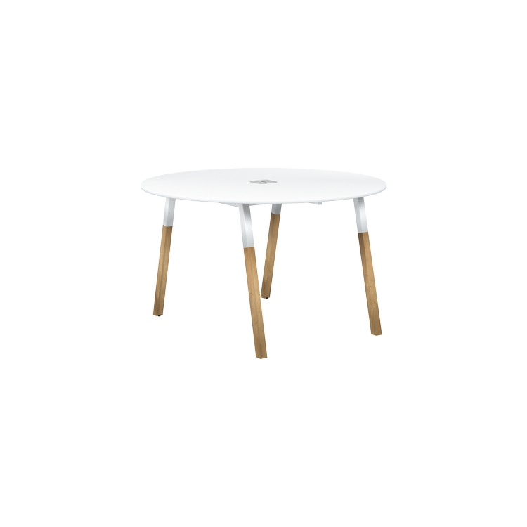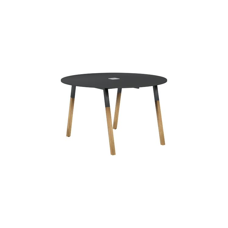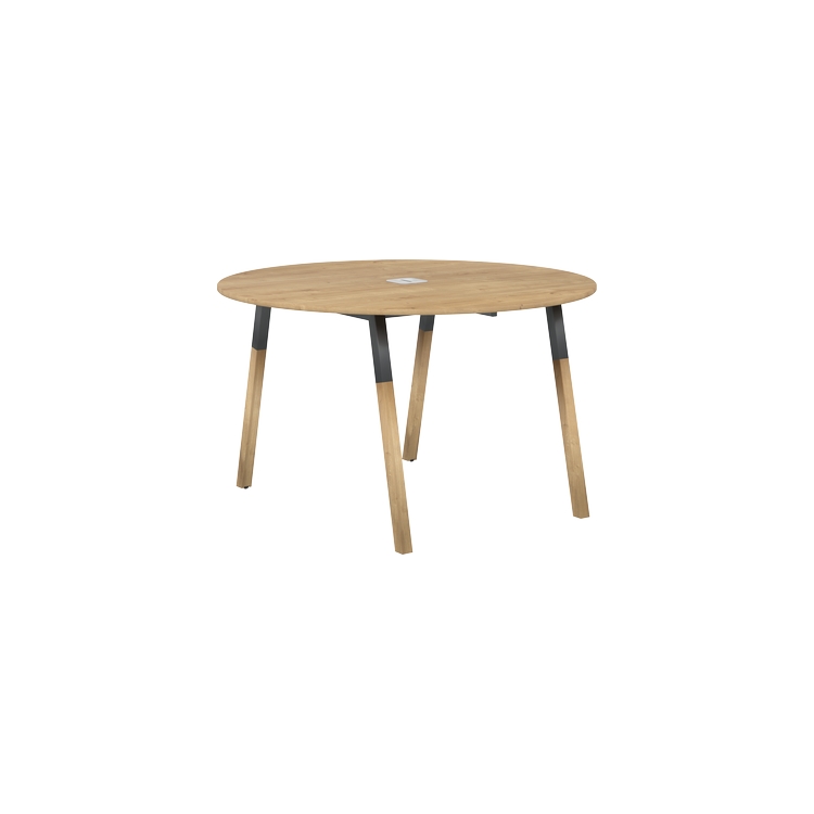 Столешница круглая из ЛДСП т.18 мм. c кромкой ABS т.2.мм, комплектуется квадратной заглушкой кабель-канала в центре, 2-мя траверсами и комбинированными опорами А-образной формы, верхняя часть из трубы 40х40 мм и нижняя часть материал – массив бука; отделка – масло-воск.