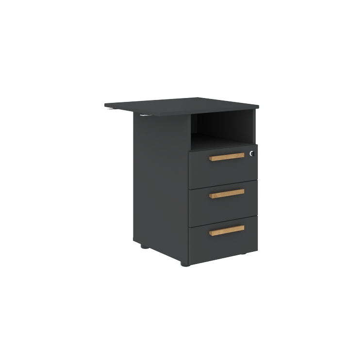 Тумба приставная с открытой нишей, полностью - из ЛДСП т.18 мм, с кромками ABS т.2мм и 0,45 мм, комплектуется центральным замком, регулируемыми опорами шкафной группы 50х27 черного цвета. Ящики-фолдинг, дно белого цвета.