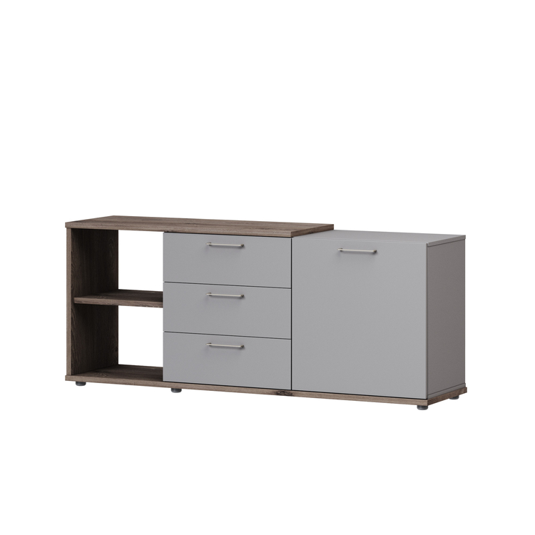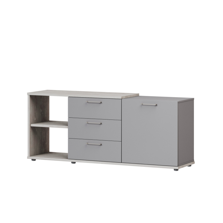 Крышка, низ, бок и полка накладки тумбы приставной выполнены из ЛДСП 25 мм, остальные детали тумбы - из ЛДСП 18 мм «Кубанит серый». Тумба с 3 ящиками, распашной дверью и нишей. Ящики плавного закрывания на шариковых направляющих полного выдвижения с доводчиками.
